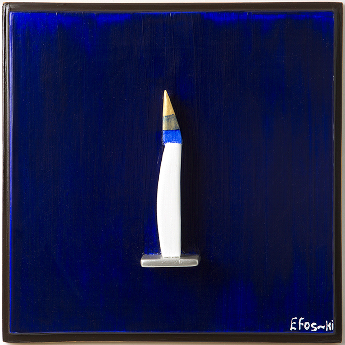 - The Aesthetic: A slender, curved form representing a candle is set against a rich, textured navy background. The use of white, blue, and gold-toned acrylics on the sculpted wood creates a striking visual contrast that mimics the glow of a light source in the dark.