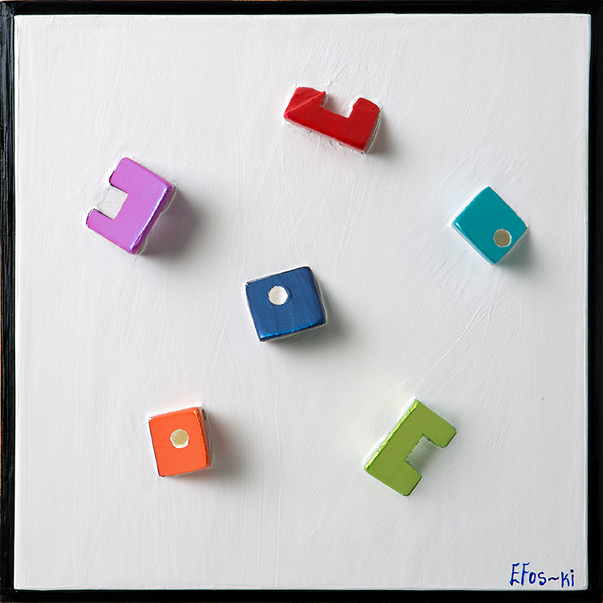 - The Aesthetic: Six distinct, sculptural forms in a spectrum of lively acrylics—magenta, crimson, cyan, royal blue, orange, and lime green—are scattered across a stark white, textured background. Each piece features unique indentations and geometric cut-outs, creating a language of abstract symbols.