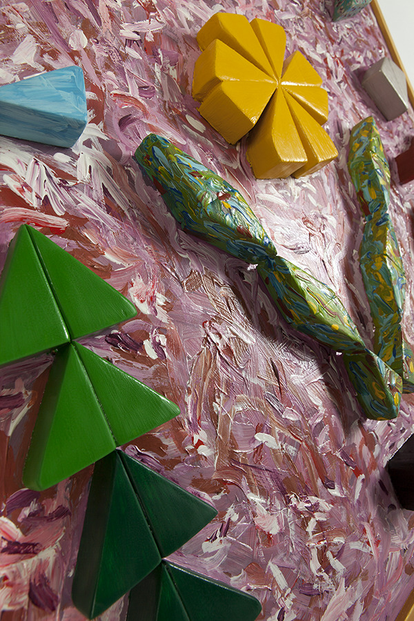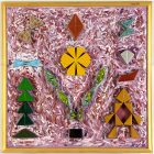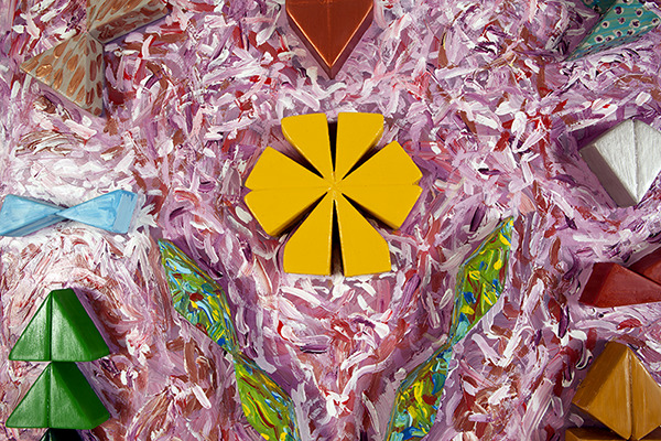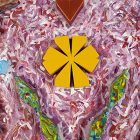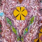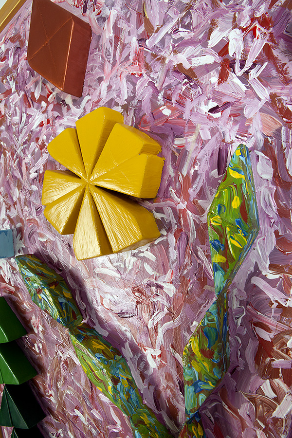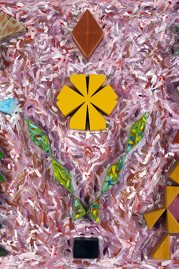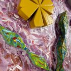 - The Aesthetic: Set against a thick, impasto background of swirling pink, white, and violet brushstrokes, the composition features a central, radiant yellow “sun” or flower motif. It is surrounded by a constellation of abstract forms, including a green coniferous tree, a golden-yellow robot-like figure, and various patterned geometric shards, creating a rich, narrative-driven visual experience.