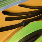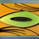 - The Aesthetic: Set against a smooth, warm orange background, the composition is dominated by a central, leaf-shaped eye. The vibrant lime-green interior is anchored by a dark, horizontal pupil, while sweeping black lashes curve gracefully above and below the central form, creating a high-energy visual rhythm.