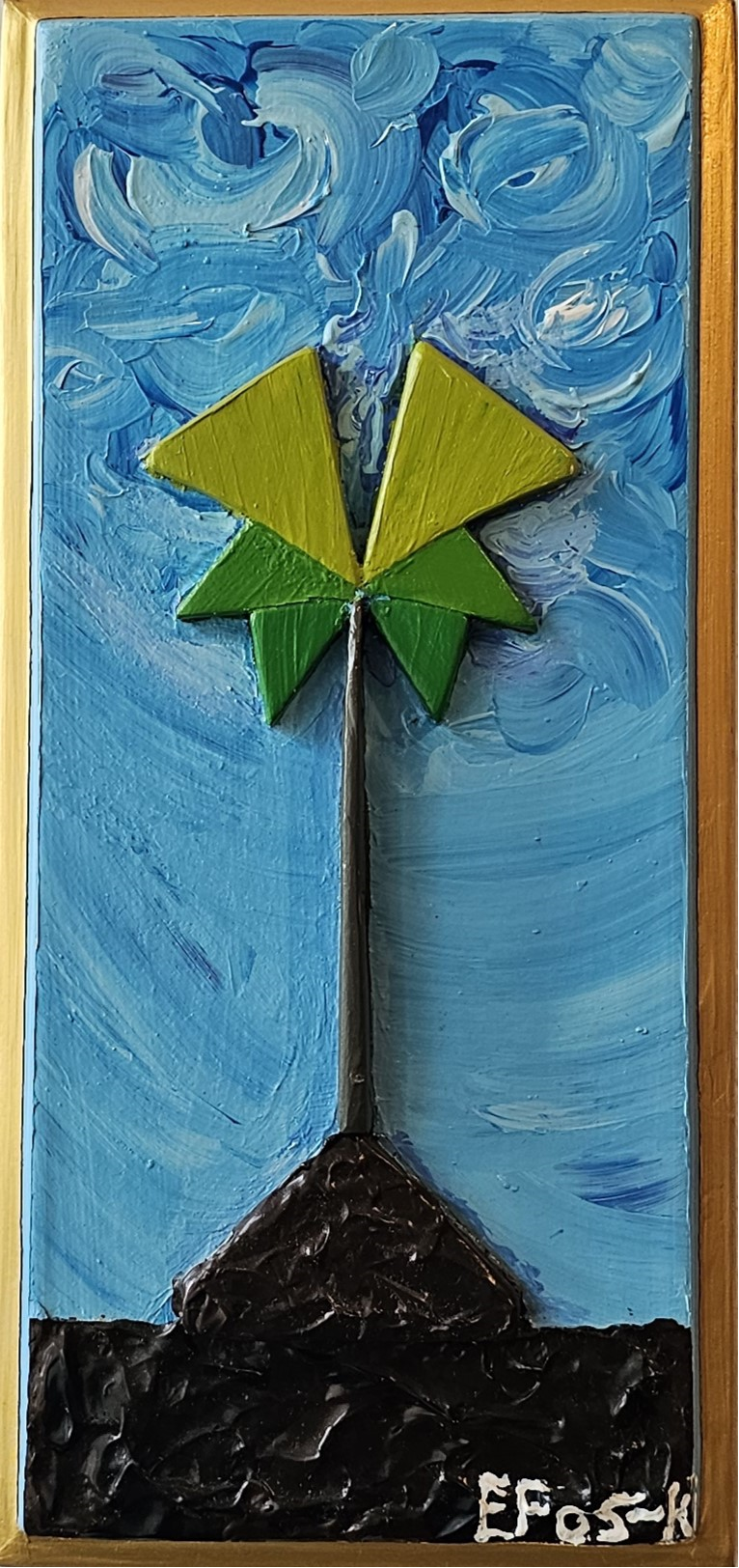 - 3D Depth: Utilising the signature mixed technique of inlay-wood sculpture and painting, the tree’s canopy and trunk are physically raised from the base. This creates a tangible sense of volume, where the angular leaves cast delicate shadows against the expressive, impasto brushwork of the sky.
