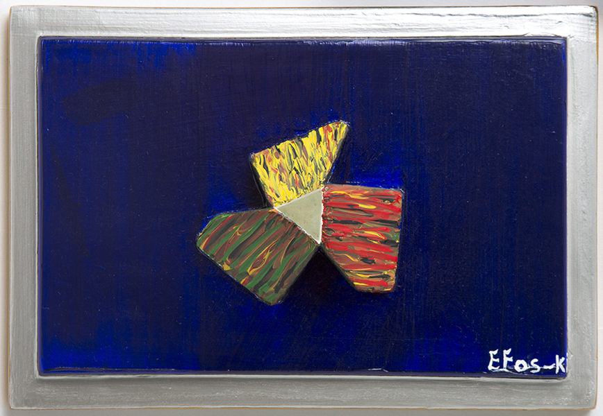 - The Aesthetic: Set against a deep, midnight-blue background, the composition features three heart-like or triangular wooden segments that meet at a central silver core. Each segment is decorated with energetic, multi-coloured brushstrokes, ranging from fiery reds and yellows to earthy greens and browns, creating a high-contrast visual rhythm against the dark field.